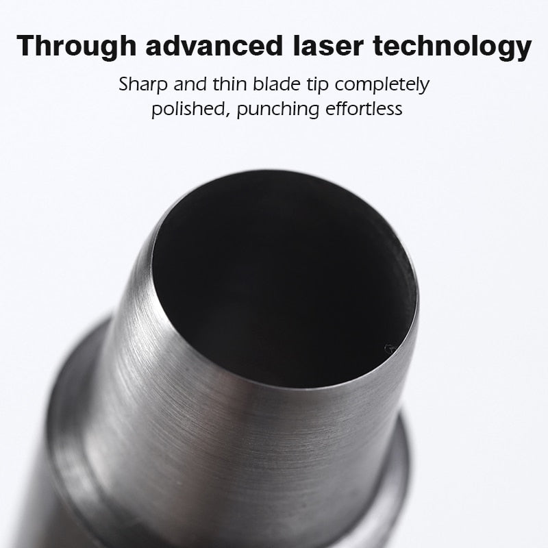 High quality temperature treated alloy steel with a thin blade tip which is polished making punching effortless.